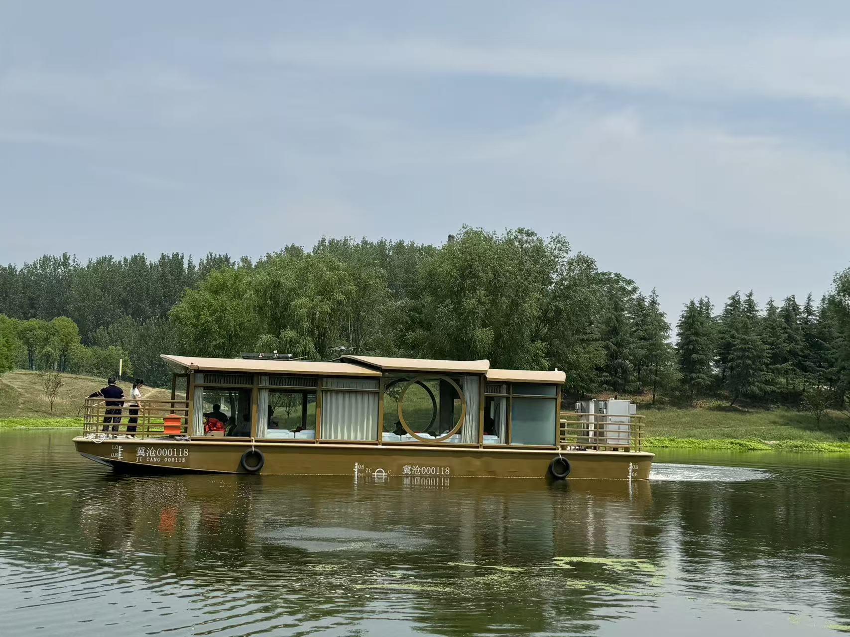 名称:TZN1550铝合金新能源游艇 规格:15.5*4.3*1.2* 乘员:42+2人 配机:7.5kw无刷电机(双机) 航速:10km/h 航区:内河C级